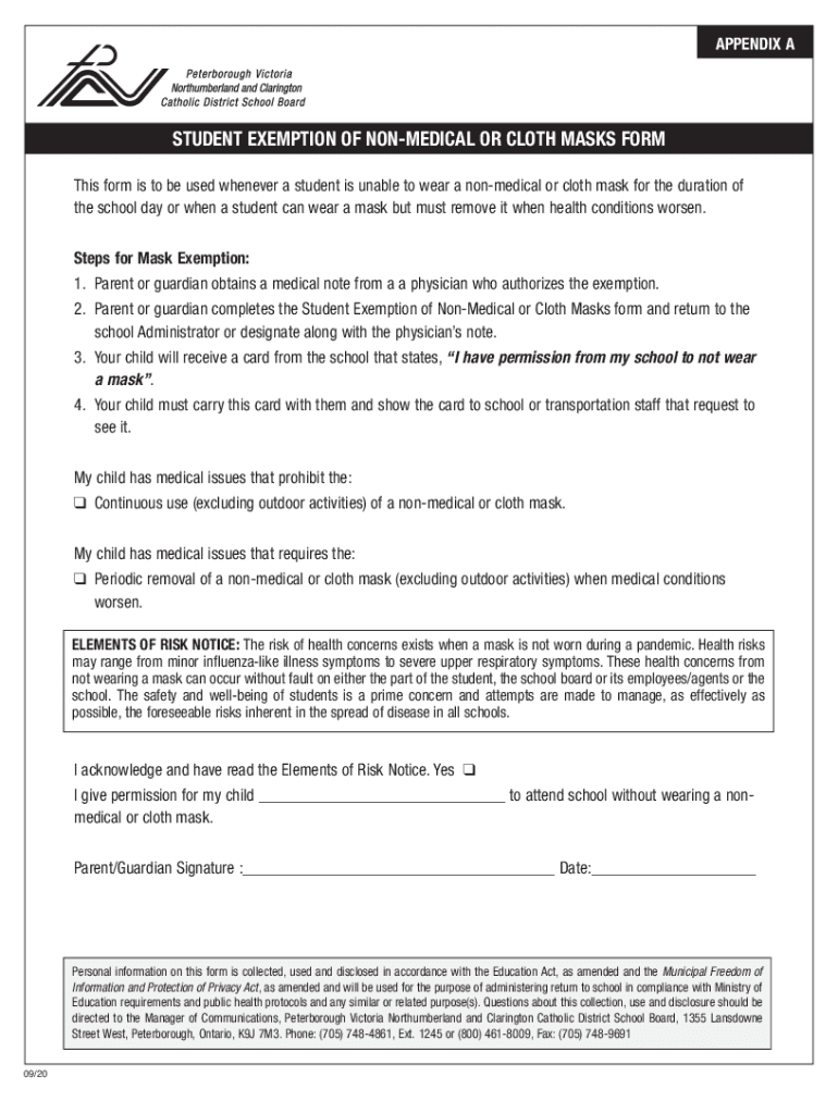 APPENDIX STUDENT EXEMPTION OF NONMEDICAL OR CLOTH MASKS FORM This form is to be used whenever a student is unable to wear a nonmedical or cloth mask for the duration of the school day or when a student