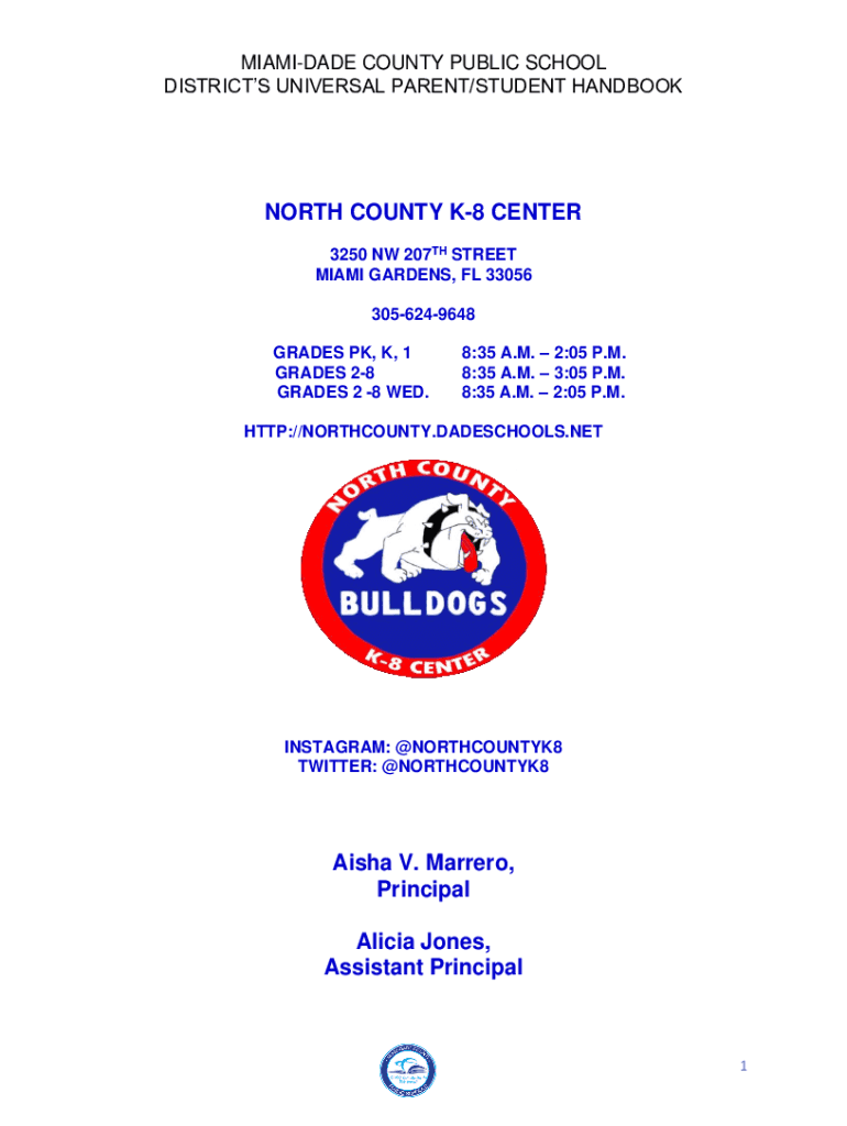 MIA MIDADE COUNTY PUBLIC SCHOOL DISTRICTS UNIVERSAL PARENT/STUDENT HANDBOOKNORTH COUNTY K8 CENTER 3250 NW 207TH STREET MIAMI GARDENS, FL 33056 3056249648 GRADES PK, K, 1 GRADES 28 GRADES 2 8 WED.8:35