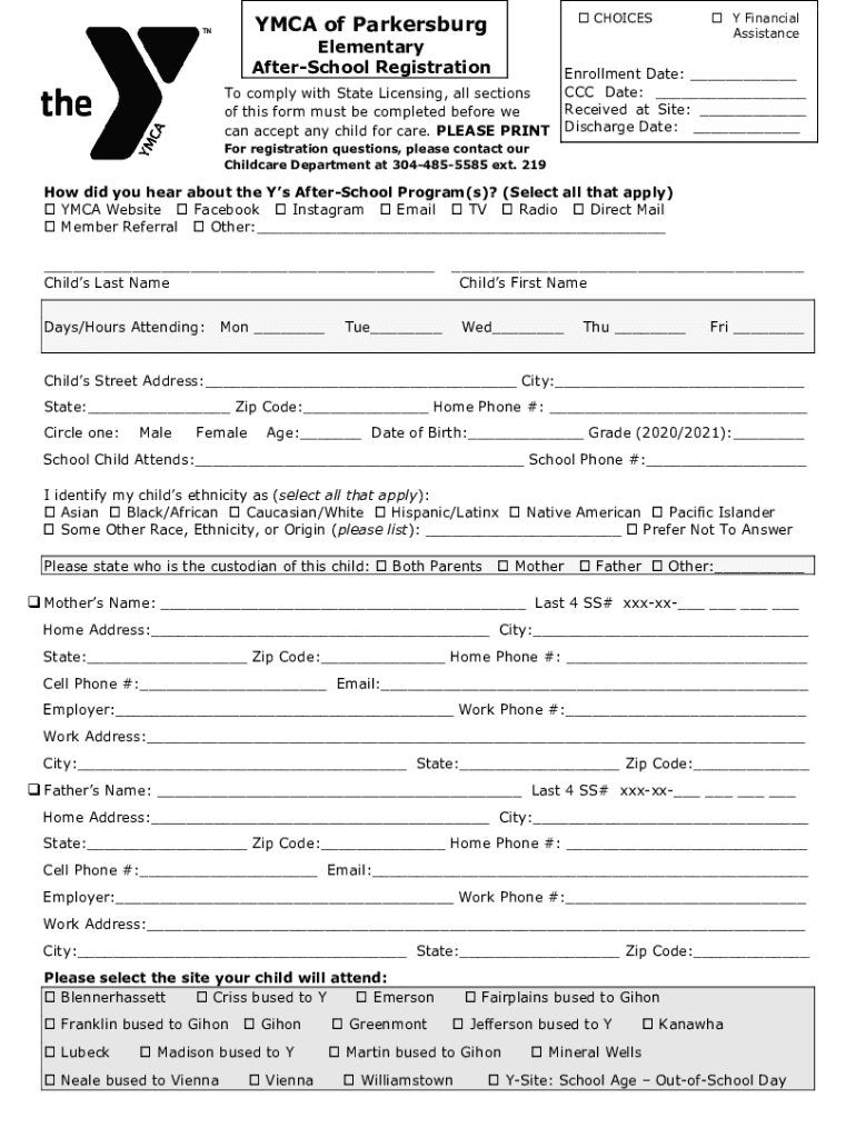 CHOICES YMCA of Parkersburg Elementary Interschool Registration To comply with State Licensing, all sections of this form must be completed before we can accept any child for care. PLEASE PRINT Financial