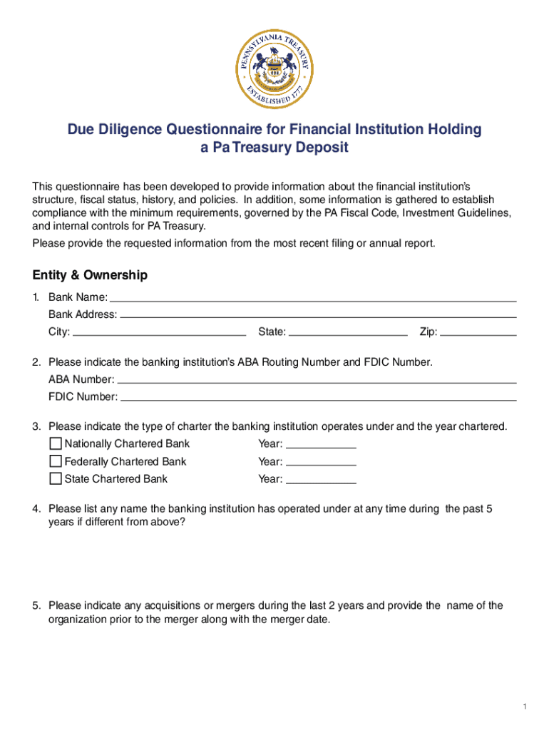 Due Diligence Questionnaire for Financial Institution Holding a Pa Treasury Deposit This questionnaire has been developed to provide information about the financial institutions structure, fiscal
