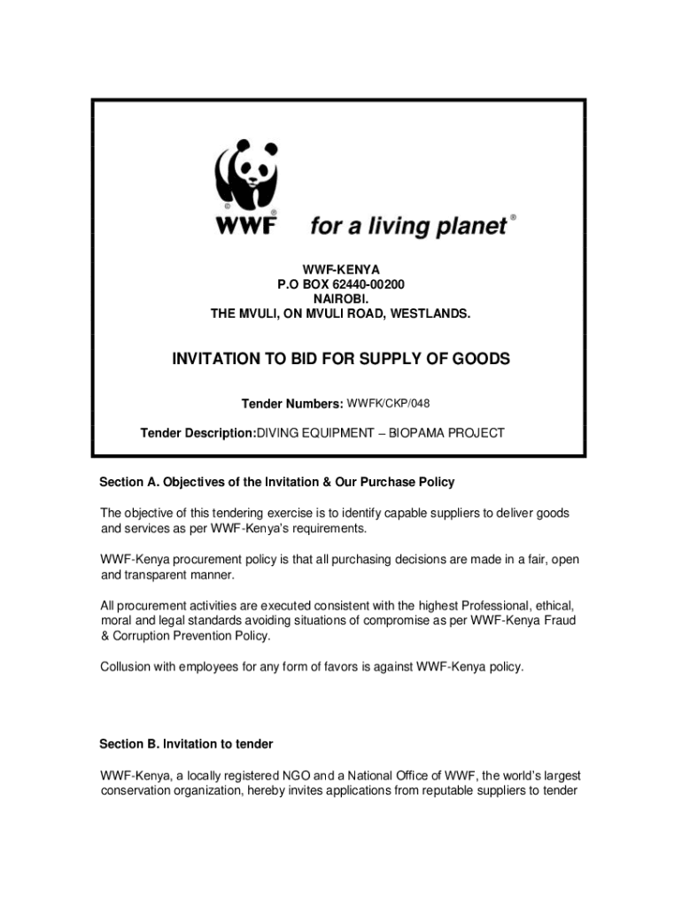 KENYA P. O BOX 6244000200 NAIROBI. THE MULTI, ON MULTI ROAD, WETLANDS.INVITATION TO BID FOR SUPPLY OF GOODS Tender Numbers: WWF/CAP/048 Tender Description:DIVING EQUIPMENT DIORAMA PROJECT Section