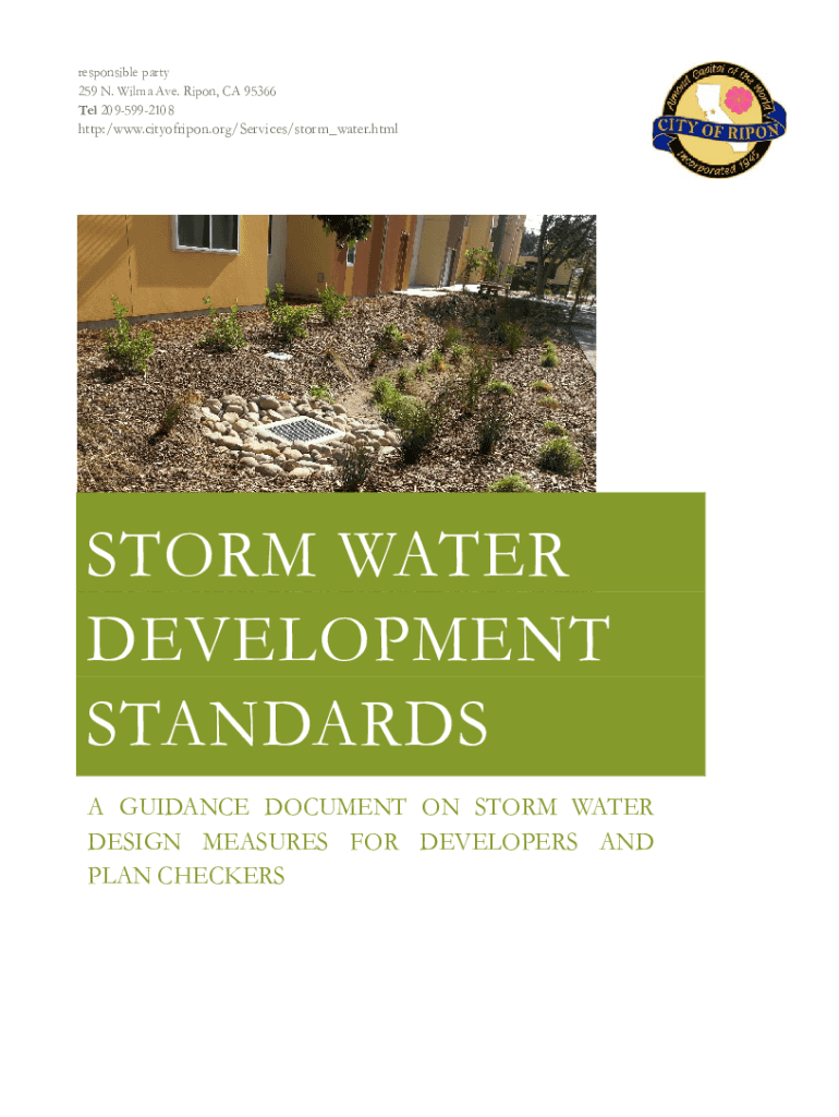 Responsible party 259 N. Wilma Ave. Ripen, CA 95366 Tel 2095992108http:/www.cityofripon.org/Services/storm_water.htmlSTORM WATER DEVELOPMENT STANDARDS A GUIDANCE DOCUMENT ON STORM WATER DESIGN MEASURES