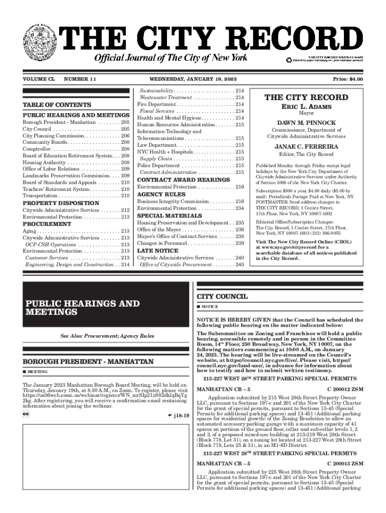 205VOLUME NUMBER 11TABLE OF CONTENTS PUBLIC HEARINGS AND MEETINGS Borough President Manhattan 205 City Council 205 City Planning Commission206 Community Boards