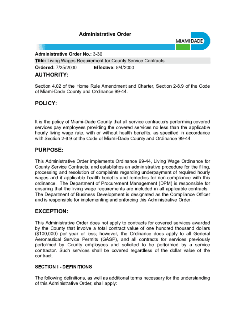 Administrative OrderAdministrative Order No.: 330 Title: Living Wages Requirement for County Service Contracts Ordered: 7/25/2000 Effective: 8/4/2000AUTHORITY: Section 4.02 of the Home Rule Amendment