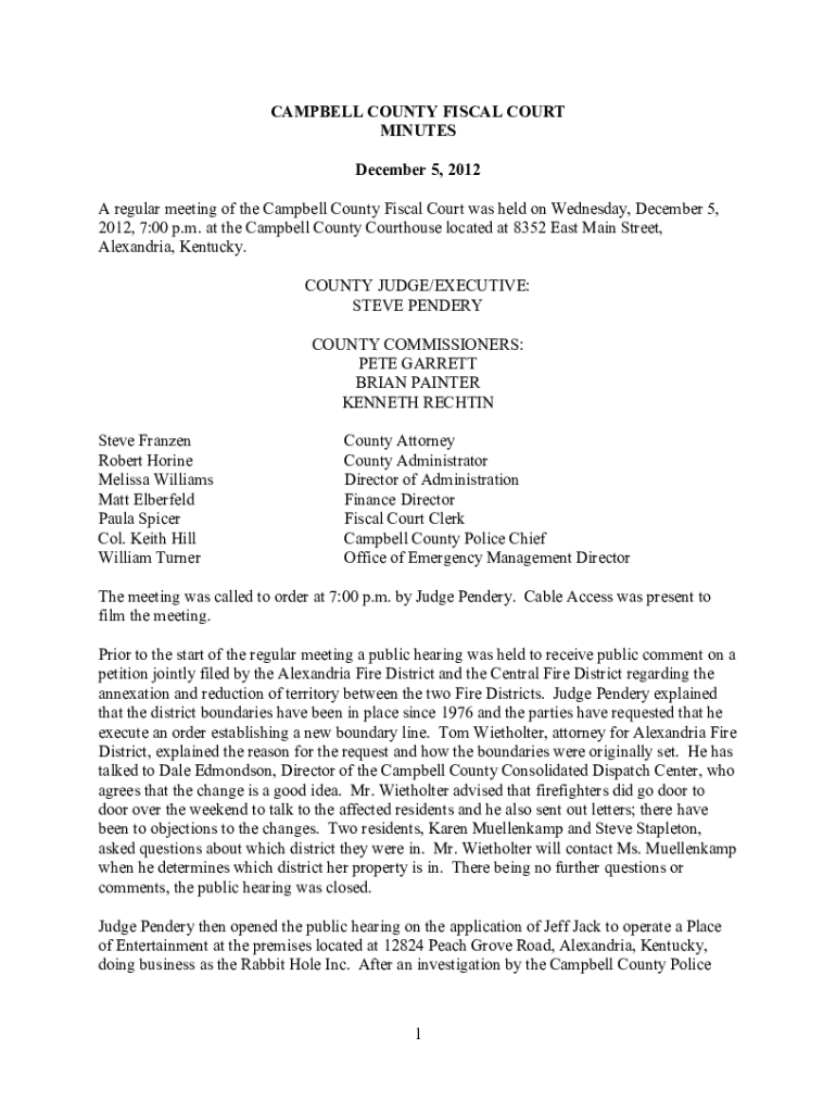 CAMPBELL COUNTY FISCAL COURT MINUTES December 5, 2012, A regular meeting of the Campbell County Fiscal Court was held on Wednesday, December 5, 2012, 7:00 p.m. at the Campbell County Courthouse located