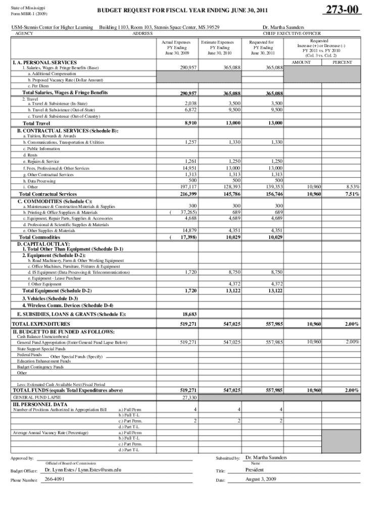State of Mississippi Form MBR1 (2009)USMStennis Center for Higher Learning27300BUDGET REQUEST FOR FISCAL YEAR ENDING JUNE 30, 2011, Building 1103, Room 103, Tennis Space Center, MS 39529AGENCYDr.