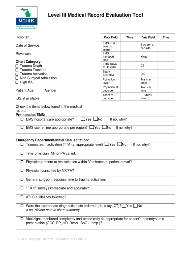 Level III Medical Record Evaluation ToolHospital:Data FieldTimeEMS total
