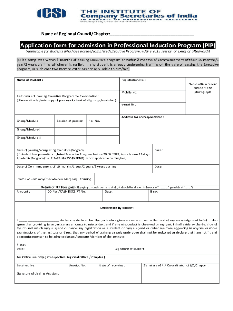Name of Regional Council/Chapter:___Application form for admission in Professional Induction Program (PIP) (Applicable for students who have passed/completed Executive Program in June 2015 session