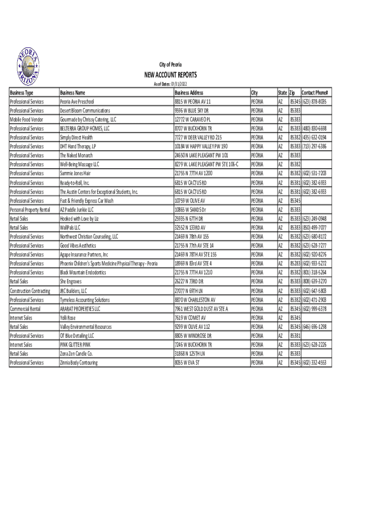 City of Peoria ACCOUNT REPORTS As of Dates: 07/31/2022Business Type Professional Services Mobile Food Vendor Professional Services Personal Property Rental Retail Sales Professional Services Retail