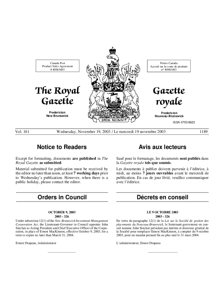 Canada Post Product Sales Agreement # 40065485Postes Canada Accord SUR la venue DE products no 40065485The Royal GazetteGazette royaleFredericton New Brunswick Fredericton NouveauBrunswick ISSN 07038623Vol.