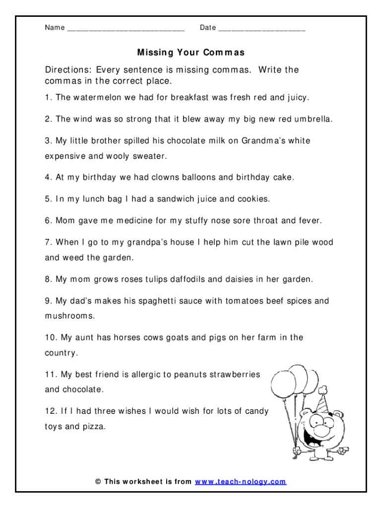 Name ___ Date ___Missing Your Commas Directions: Every sentence is missing commas. Write the commas in the correct place. 1. The watermelon we had for breakfast was fresh red and juicy. 2. The wind