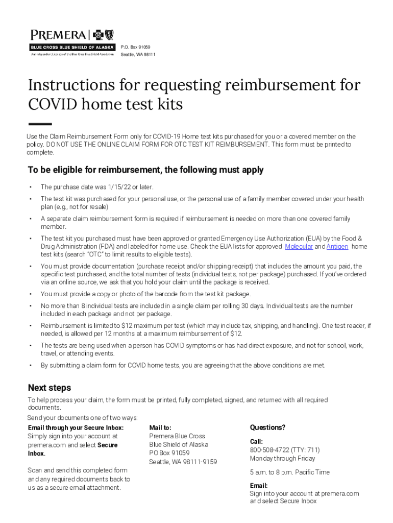 P.O. Box 91059 Seattle, WA 98111Instructions for requesting reimbursement for COVID-19 home test kits Use the Claim Reimbursement Form only for COVID-19 Home test kits purchased for you or a covered