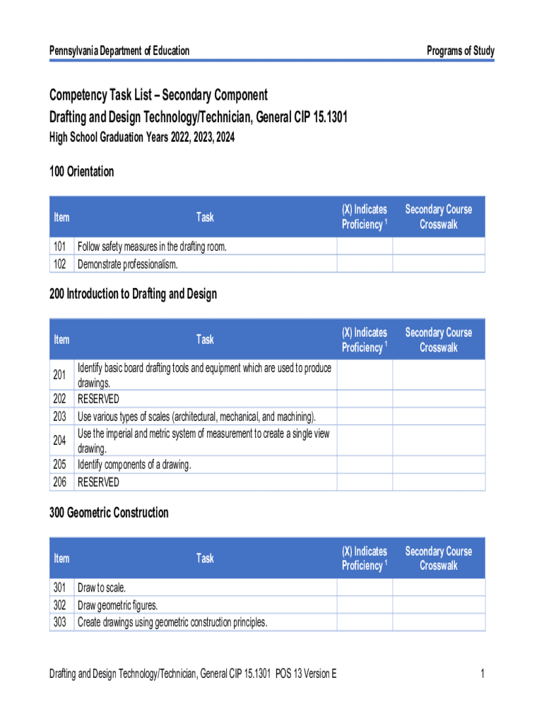 Pennsylvania Department of EducationPrograms of StudyCompetency Task List Secondary Component Drafting and Design Technology/Technician, General CIP 15.1301 High School Graduation Years 2022, 2023,