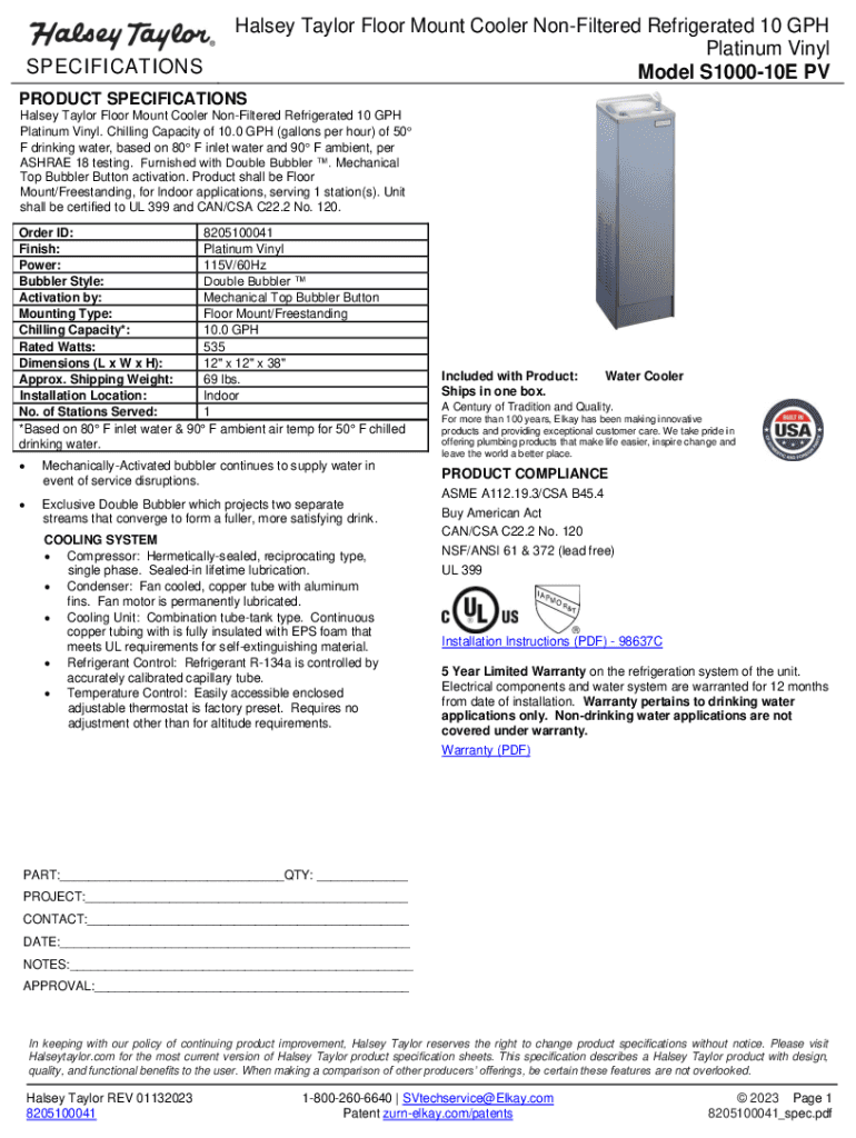SPECIFICATIONS Halsey Taylor Floor Mount Cooler Unfiltered Refrigerated 10 MPH Platinum Vinyl Model S100010E PRODUCT SPECIFICATIONS Halsey Taylor Floor Mount Cooler Unfiltered Refrigerated 10 MPH