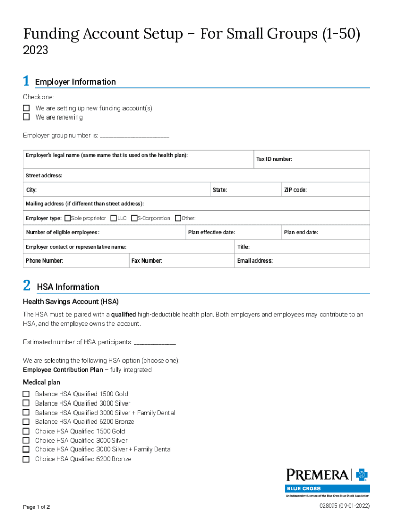 Funding Account Setup For Small Groups (150) 20231Employer InformationCheck one: We are setting up new funding account(s) We are renewing Employer group number is: ___ Employers legal name (same name