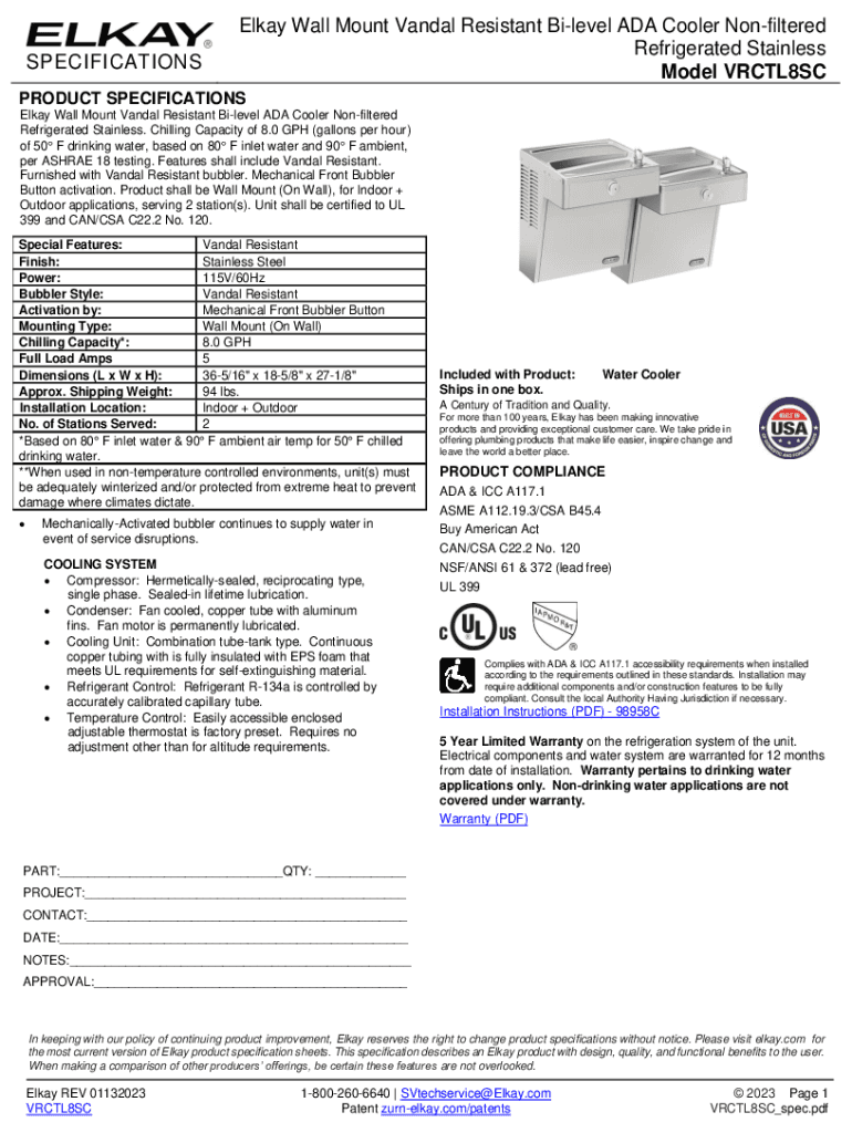 SPECIFICATIONSElkay Wall Mount Vandal Resistant Bi level ADA Cooler Nonfiltered Refrigerated Stainless Model VRCTL8SCPRODUCT SPECIFICATIONS Elway Wall Mount Vandal Resistant Bi level ADA Cooler Nonfiltered