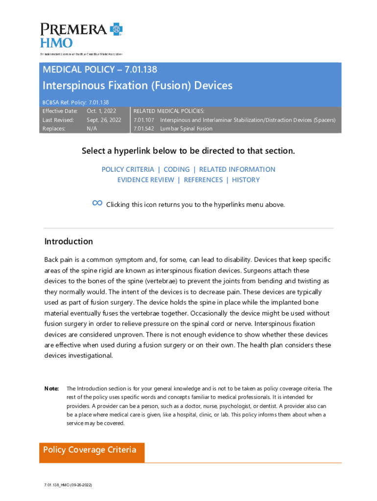 MEDICAL POLICY 7.01.138Interspinous Fixation (Fusion) Devices BC BSA Ref. Policy: 7.01.138 Effective Date:Oct. 1, 2022RELATED MEDICAL POLICIES:Replaces:N/A7.01.542Last Revised:Sept. 26, 20227.01.107Interspinous