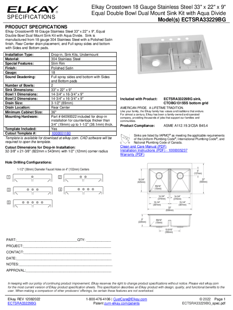SPECIFICATIONSElkay Crosstown 18 Gauge Stainless Steel 33\” x 22\” x 9\” Equal Double Bowl Dual Mount Sink Kit with Aqua Divide Model(s) ECTSRA33229BGPRODUCT SPECIFICATIONS Elway Crosstown 18