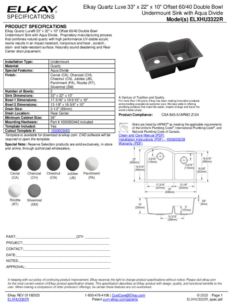 SPECIFICATIONSElkay Quartz Luke 33\” x 22\” x 10\” Offset 60/40 Double Bowl Under mount Sink with Aqua Divide Model(s) ELXHU3322RPRODUCT SPECIFICATIONS Elway Quartz Luke 33\” x 22\” x 10\”
