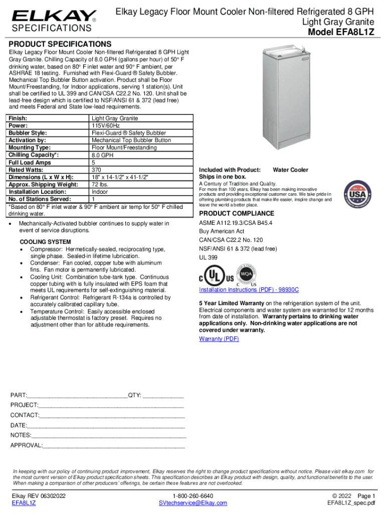 SPECIFICATIONSElkay Legacy Floor Mount Cooler Nonfiltered Refrigerated 8 MPH Light Gray Granite Model EFA8L1ZPRODUCT SPECIFICATIONS Elway Legacy Floor Mount Cooler Nonfiltered Refrigerated 8 MPH Light