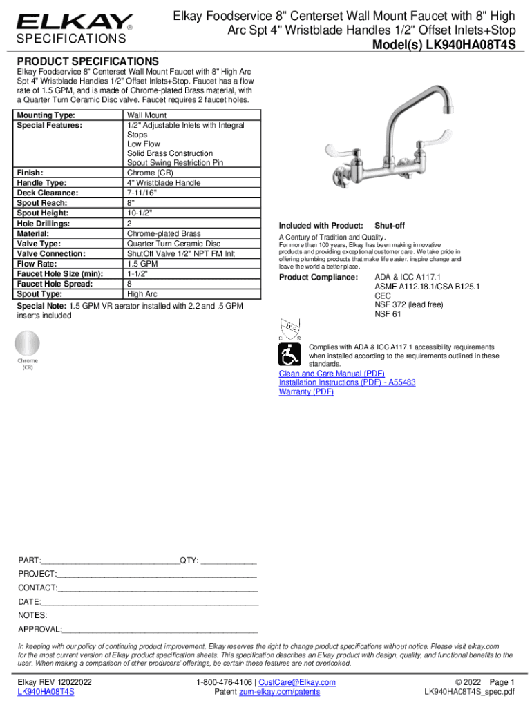 SPECIFICATIONSElkay Food service 8\” Center set Wall Mount Faucet with 8\” High Arc SPT 4\” Wrist blade Handles 1/2\” Offset Inlets+Stop Model(s) LK940HA08T4SPRODUCT SPECIFICATIONS Elway Food