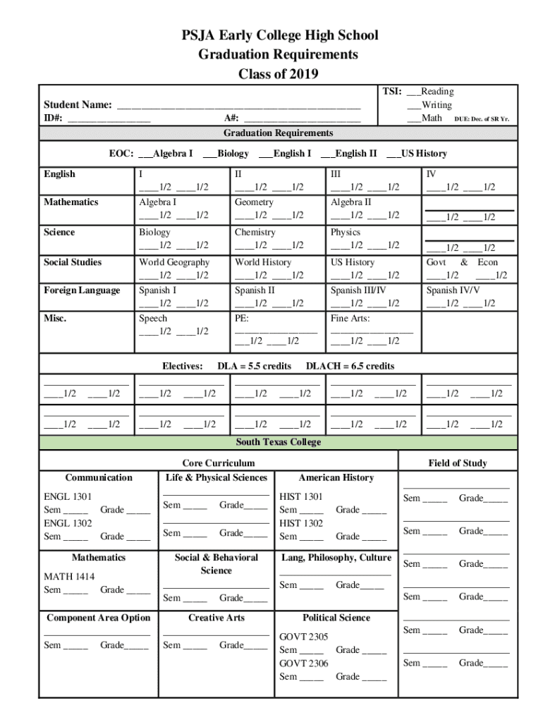 PSA Early College High School Graduation Requirements Class of 2019 Student Name: ___ ID#: ___A#: ___ Graduation Requirements: ___Algebra I ___Biology English Mathematics Science Social Studies Foreign