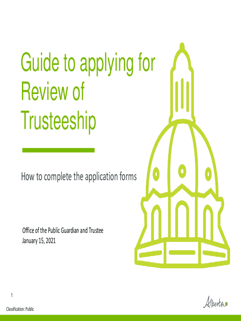 Guide to applying for Review of Trusteeship How to complete the application formsOffice of the Public Guardian and Trustee January 15, 20211 Classification: PublicImportant Disclaimer The information