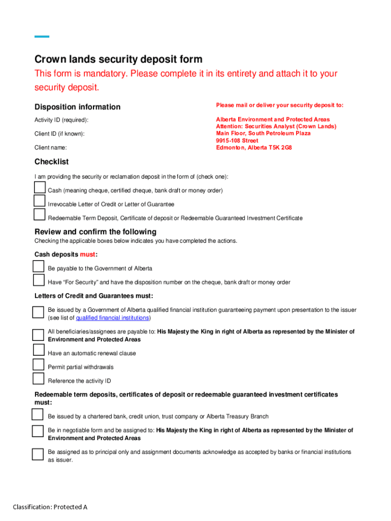 Crown lands security deposit form This form is mandatory. Please complete it in its entirety and attach it to your security deposit. Disposition information Activity ID (required): Client ID (if known):