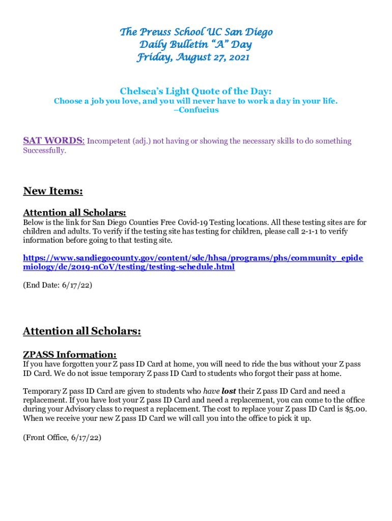 The Press School UC San Diego Daily Bulletin A Day Sat Word: Archangel N. An Angel Of High Rank. Friday, August 27, 2021, Chelsea's Light Quote of the Day: Choose a job you love, and you will never