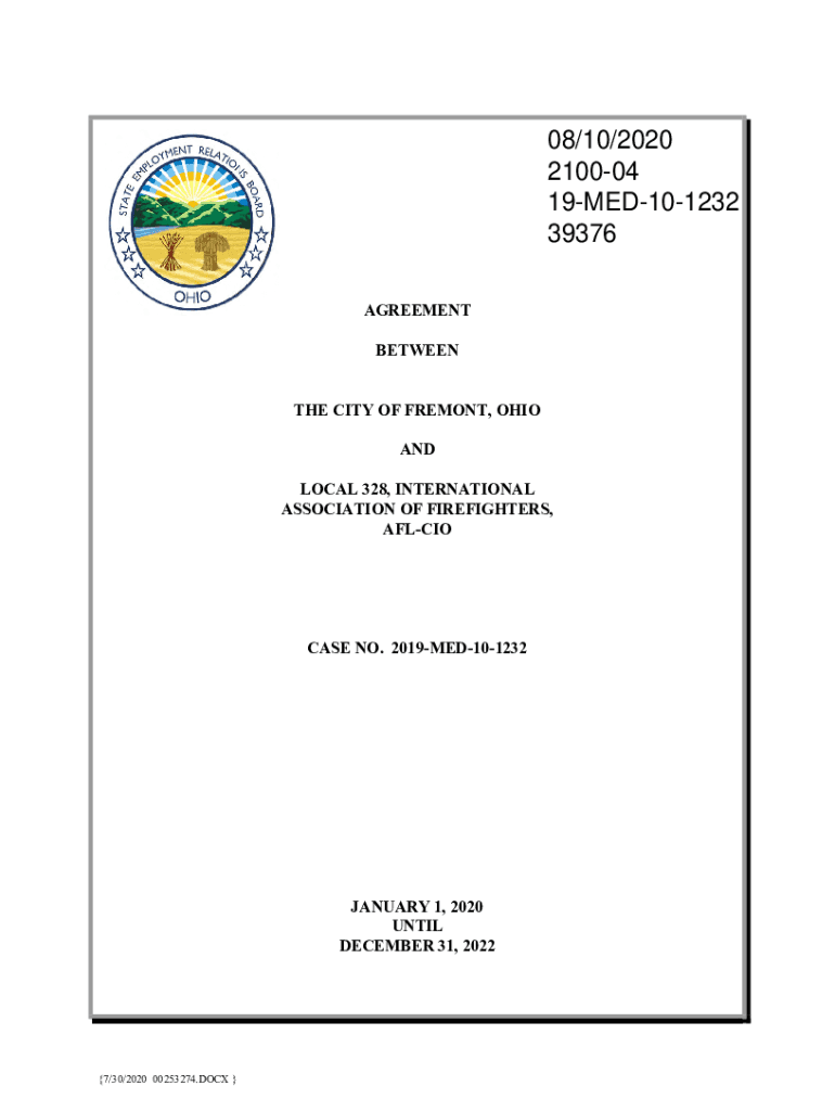 08/10/2020 210004 19MED101232 39376 AGREEMENT BETWEEN THE CITY OF FREMONT, OHIO AND LOCAL 328, INTERNATIONAL ASSOCIATION OF FIREFIGHTERS, AFLCIOCASE NO. 2019MED101232JANUARY 1, 2020 UNTIL DECEMBER