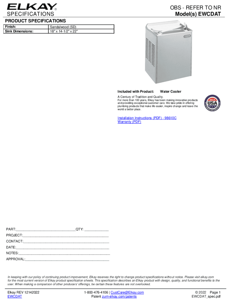 OBS REFER TO NR Model(s) EWCDATSPECIFICATIONS PRODUCT SPECIFICATIONS Finish: Sink Dimensions:Sandalwood (SD) 18\” x 141/2\” x 22\” Included with Product:Water Cholera Century of Tradition and