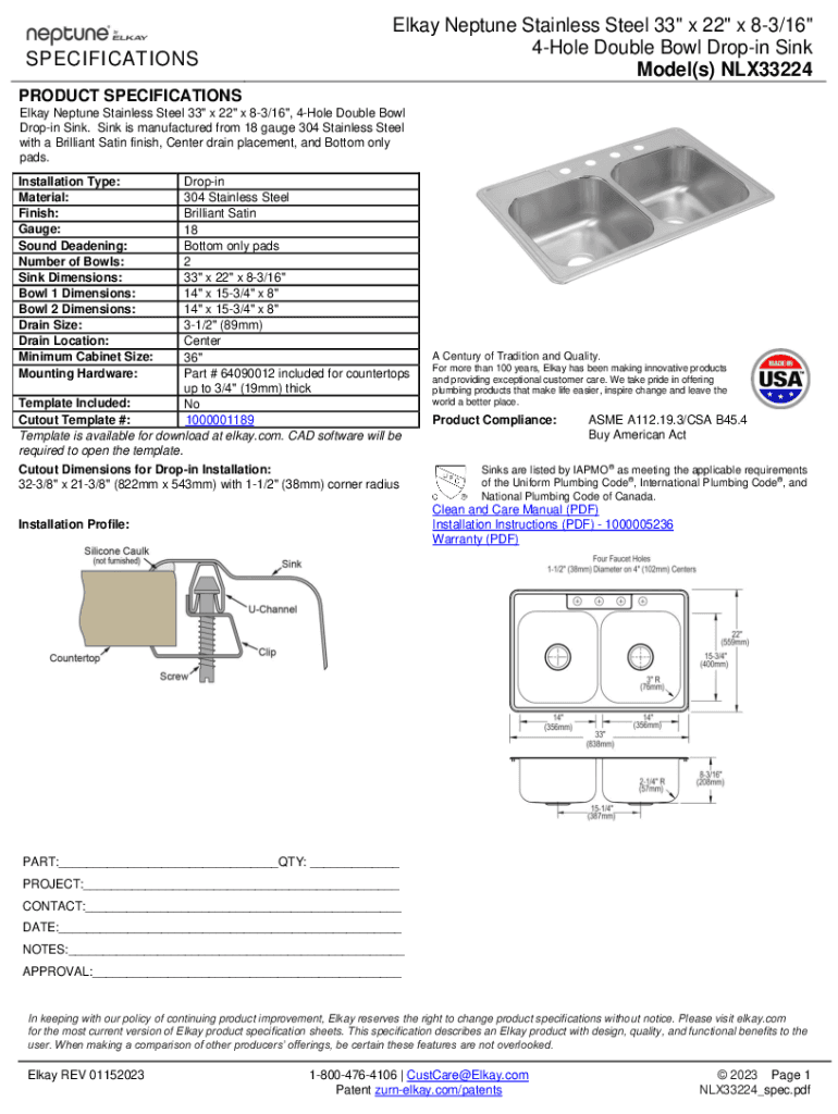 SPECIFICATIONSElkay Neptune Stainless Steel 33\” x 22\” x 83/16\” 4Hole Double Bowl Drop in Sink Model(s) NLX33224PRODUCT SPECIFICATIONS Elway Neptune Stainless Steel 33\” x 22\” x 83/16\”,