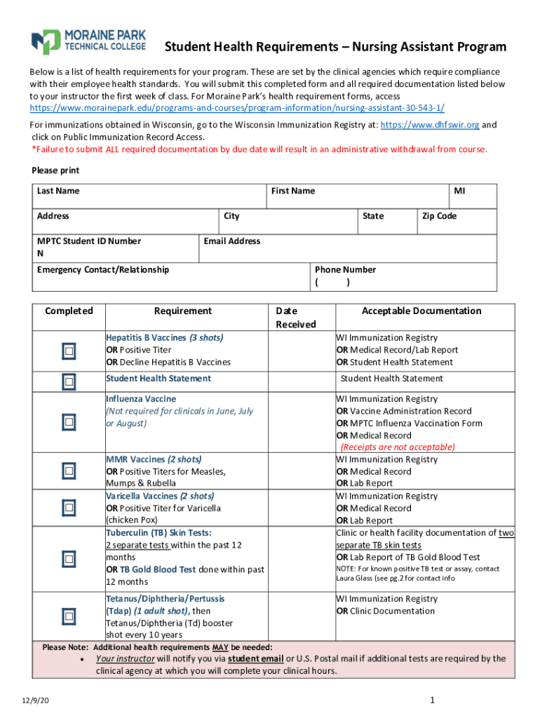 Get the free Nursing Assistant Student Health Requirements - libs morainepark
