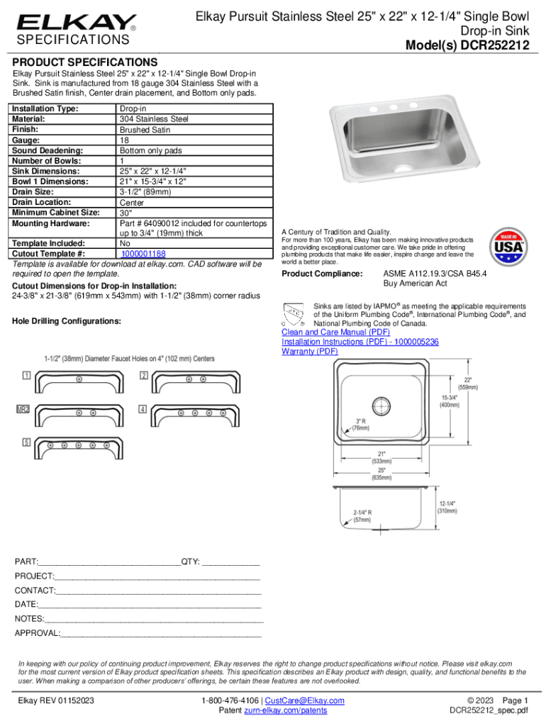 SPECIFICATIONSElkay Pursuit Stainless Steel 25\” x 22\” x 121/4\” Single Bowl Drop in Sink Model(s) DCR252212PRODUCT SPECIFICATIONS Elway Pursuit Stainless Steel 25\” x 22\” x 121/4\”