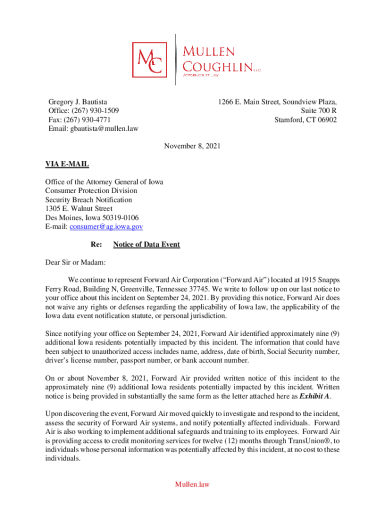 Gregory J. Bautista Office: (267) 9301509 Fax: (267) 9304771 Email: gbautista@mullen.law1266 E. Main Street, Sound view Plaza, Suite 700 R Stamford, CT 06902November 8, 2021 VIA EMAIL Office of the
