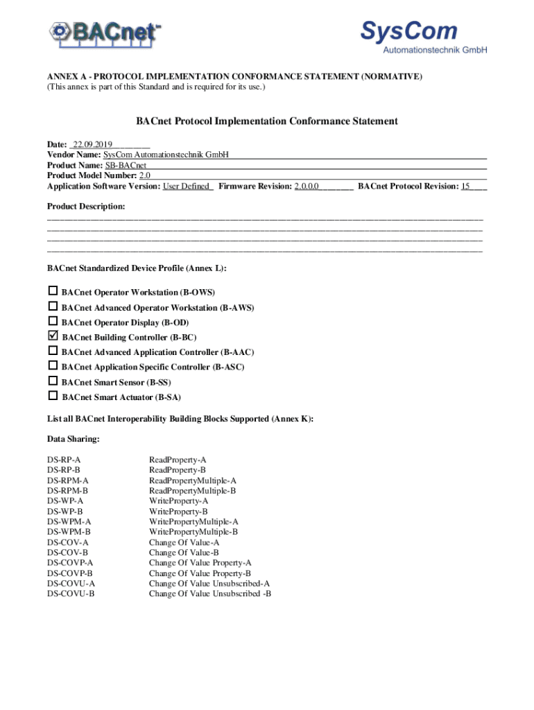 ANNEX A PROTOCOL IMPLEMENTATION CONFORMANCE STATEMENT (NORMATIVE) (This annex is part of this Standard and is required for its use.) Backed Protocol Implementation Conformance Statement Date: _22.09.2019___