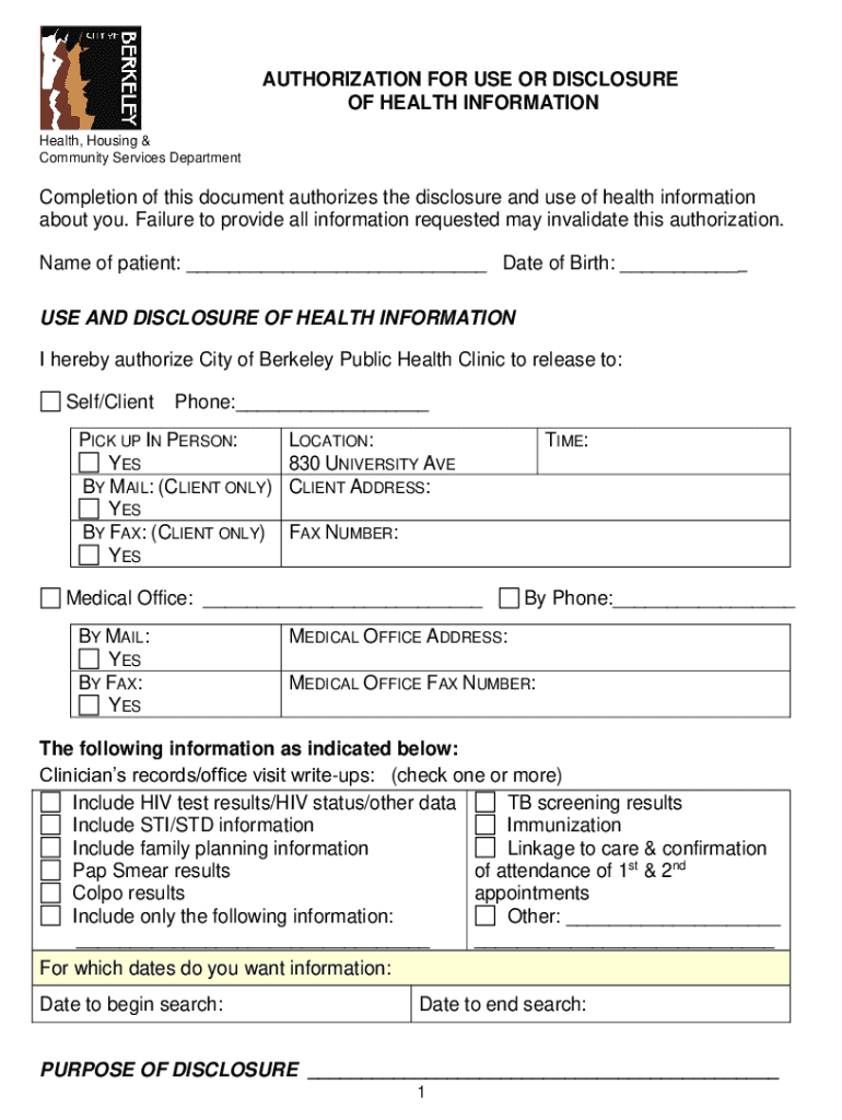 AUTHORIZATION FOR USE OR DISCLOSURE OF HEALTH INFORMATION Health, Housing & Community Services DepartmentCompletion of this document authorizes the disclosure and use of health information about you.