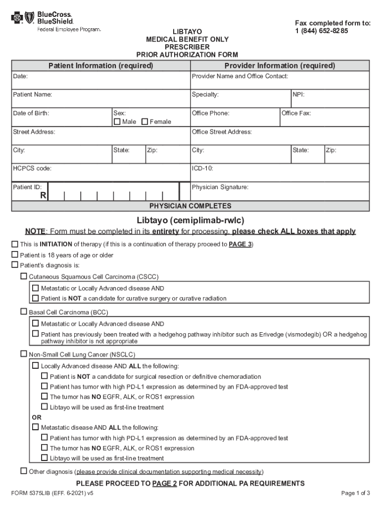 Fax completed form to: 1 (844) 6528285LIBTAYO MEDICAL BENEFIT ONLY PRESCRIBER PRIOR AUTHORIZATION Formation Information (required)Provider Information (required)Date:Provider Name and Office Contact:Patient