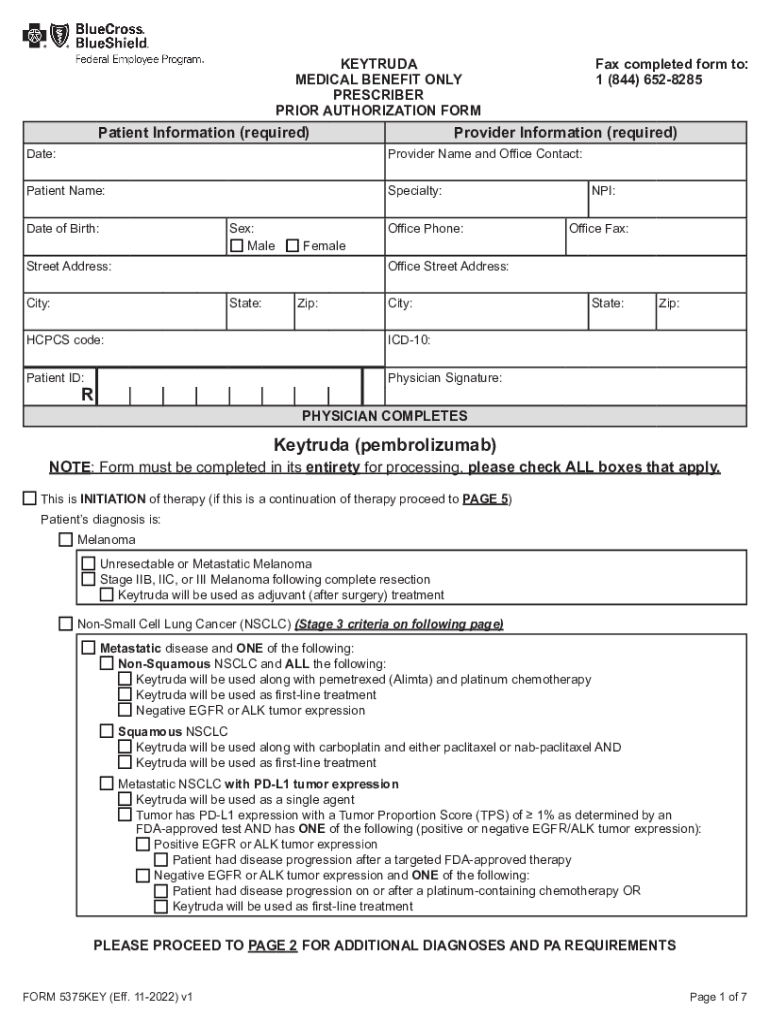 Fax completed form to: 1 (844) 6528285KEYTRUDA MEDICAL BENEFIT ONLY PRESCRIBER PRIOR AUTHORIZATION Formation Information (required)Provider Information (required)Date:Provider Name and Office Contact:Patient