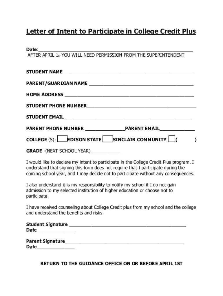 Letter of Intent to Participate in College Credit Plus Date:___ AFTER APRIL 1sr YOU WILL NEED PERMISSION FROM THE SUPERINTENDENT STUDENT NAME___ PARENT/GUARDIAN NAME ___ HOME ADDRESS ___ STUDENT PHONE