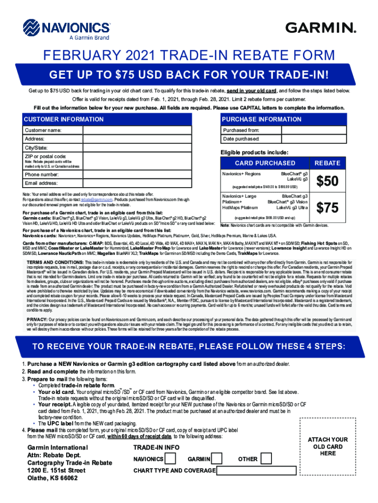 Feb. 1, 2021MARKETING mid-February 2021 TRAD EIN REBATEREBATERebate DetailsPurchase a new Avionics or Garmin g3 edition cartography card listed on the rebate form from an authorized dealer, and get