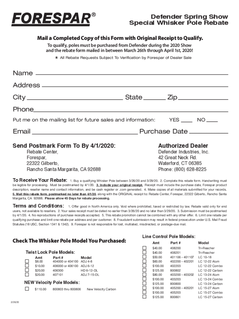 Defender Spring Show Special Whisker Pole Rebate Mail a Completed Copy of this Form with Original Receipt to Qualify. To qualify, poles must be purchased from Defender during the 2020 Show and the