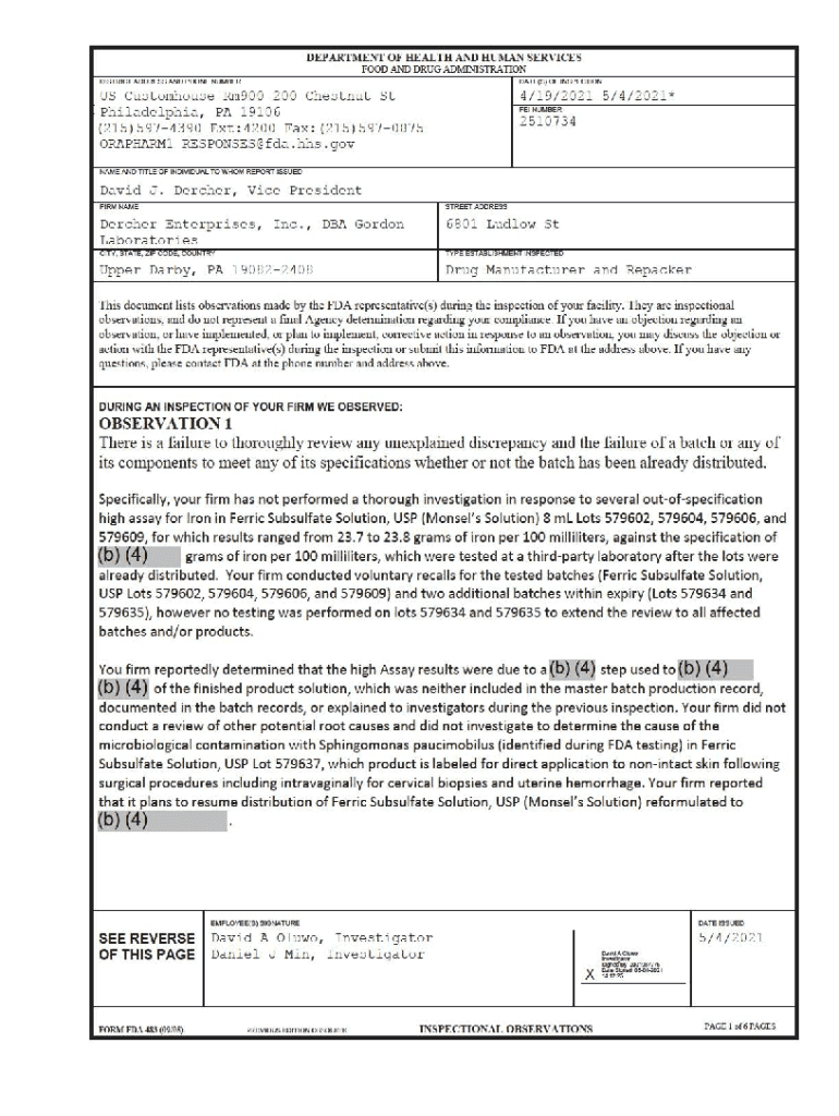 DEPARTMENT OF HEALTH AND HUMAN SERVICES FOOD AND DRUG ADMINISTRATION DI STRICT ADDRESS ANO PHONE NUMERATE(S) OF INSPECTIONS Cu s t on house Rrn900 200 Chest nut St Philadelphia, PA 1 9 1 06 (215)5974390