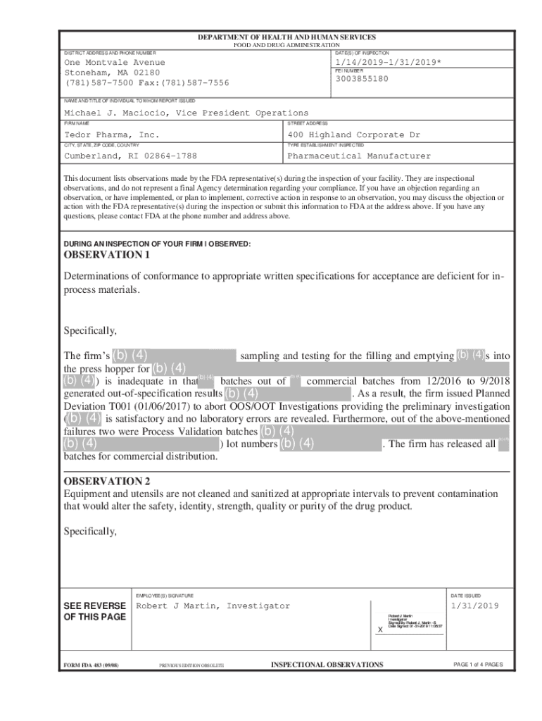 DEPARTMENT OF HEALTH AND HUMAN SERVICES FOOD AND DRUG ADMINISTRATION DISTRICT ADDRESS AND PHONE NUMERATE(S) OF Inspection Mont vale Avenue Stone ham, MA 02180 (781)5877500 Fax:(781)58775561/14/20191/31/2019*