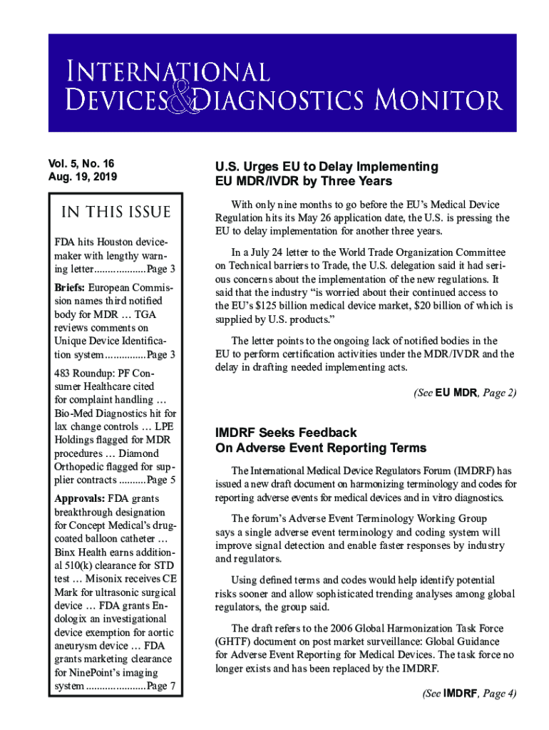 Vol. 5, No. 16 Aug. 19, 2019IN THIS ISSUE FDA hits Houston device maker with lengthy warning letter.................... Page 3 Briefs: European Commission names third notified body for MDR TGA reviews