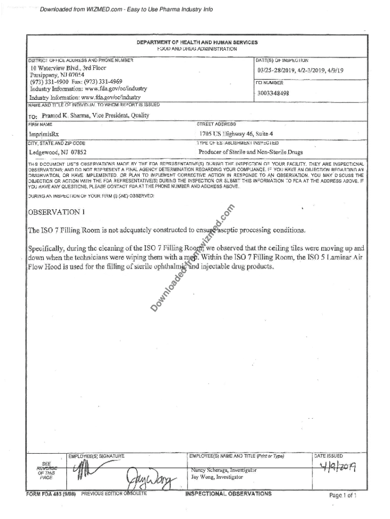 Downloaded from WIZMED.com Easy to Use Pharma Industry InfoDEPARTMENT OF HEALTH AND HUMAN SERVICES FOOD AND DRUG ADMINISTRATION DISTRICT OFFICE ADDRESS AND PHONE NUMERATE(S) OF INSPECTION10 Water