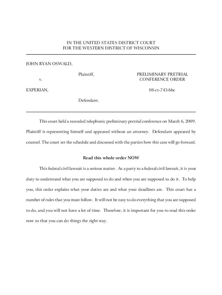 IN THE UNITED STATES DISTRICT COURT FOR THE WESTERN DISTRICT OF WISCONSINJOHN RYAN OSWALD, Plaintiff, v.PRELIMINARY PRETRIAL CONFERENCE ORDEREXPERIAN,08cv743bbc Defendant. This court held a recorded
