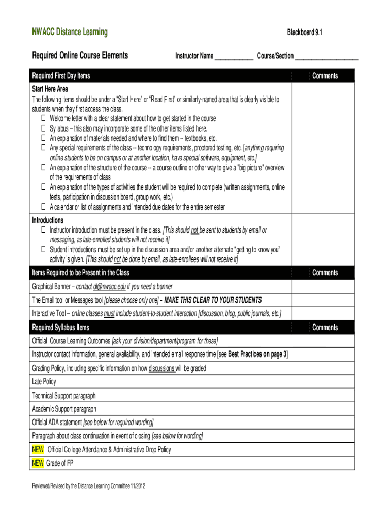 NWACC Distance Learning Required Online Course ElementsBlackboard 9.1 Instructor Name ___ Course/Section ___Required First Day ItemsCommentsStart Here Area The following items should be under a Start