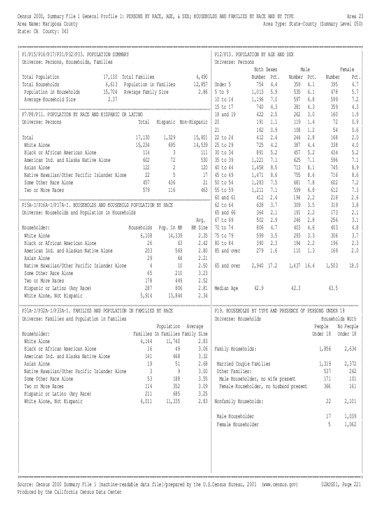 Census 2000, Summary File 1 General Profile 1: PERSONS BY RACE, AGE, & SEX; HOUSEHOLDS AND FAMILIES BY RACE AND BY TYPE Area 23 Area Name: Mariposa County Area Type: StatCounter (Summary Level 050)