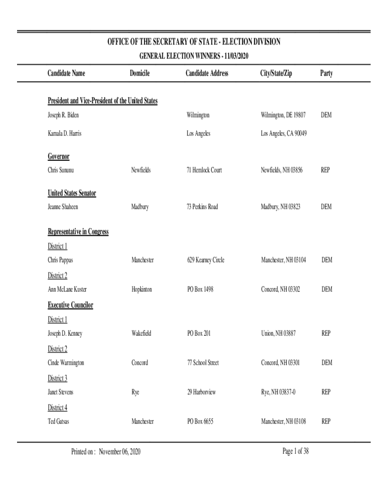 OFFICE OF THE SECRETARY OF STATE ELECTION DIVISION GENERAL ELECTION WINNERS 11/03/2020 Candidate NameDomicileCandidate Addressing/State/ZipPartyJoseph R. BidenWilmingtonWilmington, DE 19807DEMKamala